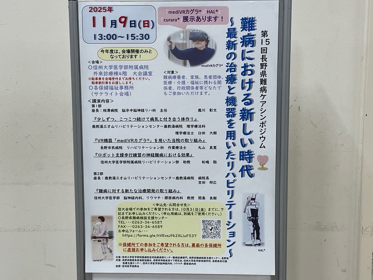 11月9日(日)、長野県難病ケアシンポジウムが信州大学医学部付属病院で開催されました。難病の患者さんやその家族の方100名ほどが参加されました。信州大学医学部付属病院の松嶋聡先生のご講演では、神経難病におけるロボット支援歩行練習の効果について、分かり易くご講演があり、みなさん熱心に聴講 pic.x.com/cUtwk4Or88