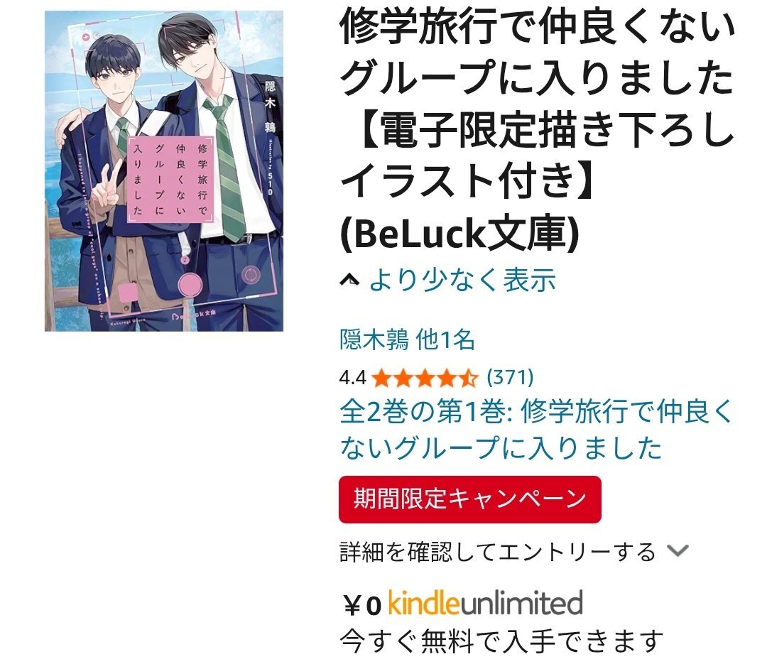 KindleUnlimitedが明日までキャンペーンやってて3ヶ月で99円だよ〜(通常は1ヶ月990円) BL漫画・小説たくさんあるよ〜修学旅行で仲良くないグループに入りました原作小説も読めるよ〜 pic.x.com/CexUGR40yn