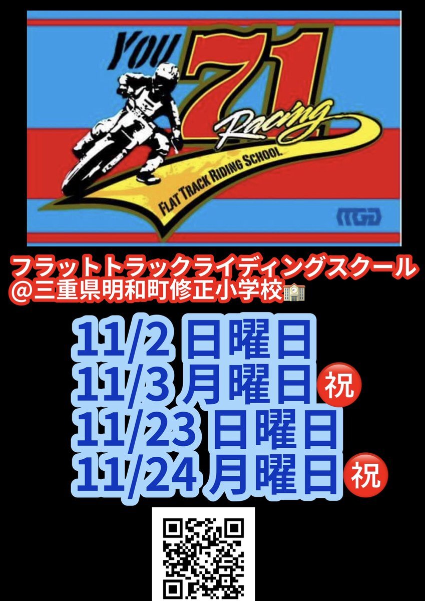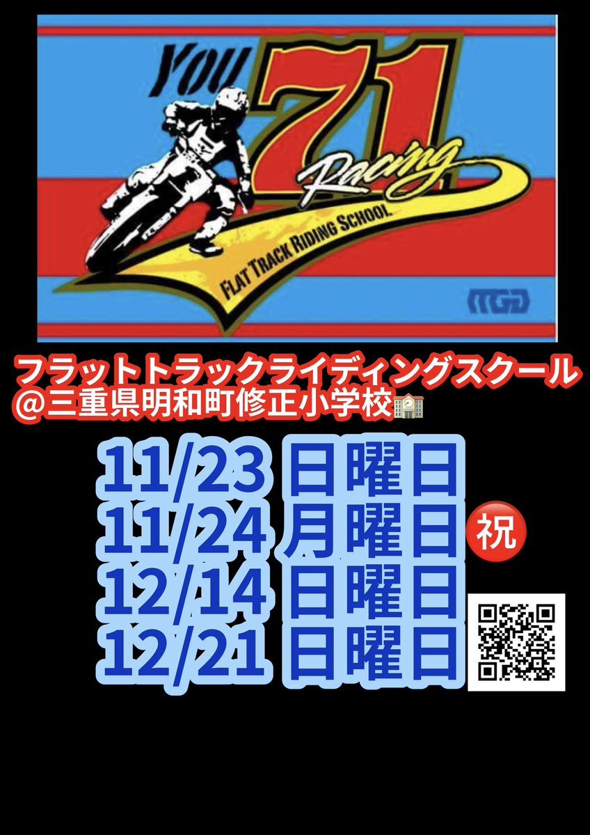 三重県明和町修正小学校でのフラットトラックライディングスクール追加決定です✨ 12/14と12/21の日曜日 両日共に翌日月曜日も先にご希望頂けましたら開催も可能です🏁 11月後半はすでにかなりのご応募頂いています🙌 お早目にどうぞ宜しくお願いします😊 71flattrack.shop-pro.jp/?mode=cate&cbi… pic.x.com/SruSkFTtX5