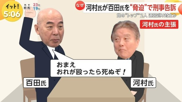 返信先:@arimoto_kaori1告訴事実が本当なら暴言のレベルをはるかに超えており日本保守党は公党としての説明責任と第三者調査が必要ではないか>保守・河村氏が百田氏を告訴=百田氏は4月22日衆院第2会館内で河村氏にペットボトル1個を投げ付けた上右手を振り上げ「あんた、俺が殴ったら死ぬぞ」と脅迫 (紀藤正樹氏) 2025.10.3