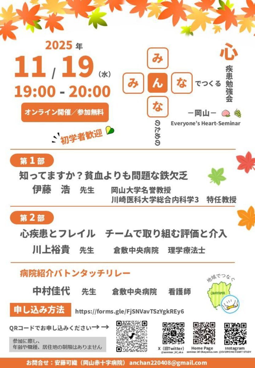 【次回第14回】 11/19(水) 19時〜 Zoom開催 無料⭐️ 申し込み seminar.hf-okayama.com 第一部:知ってますか?貧血よりも問題な鉄欠乏 第二部:心疾患とフレイル チームで取り組む評価と介入 病院紹介バトンタッチリレー 倉敷中央病院 ぜひご参加ください! pic.x.com/T1j02pN7P1