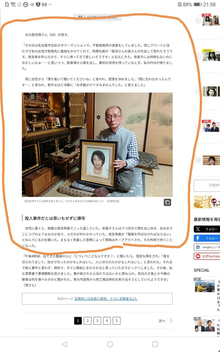 左が先程の情報からで、右側が文春オンラインからです。先程の情報からだと、高羽悟さんが、帰宅して妻が首を刺されて倒れていた妻の第一発見者みたいに読めるんですが😱文春オンラインの方は、大家が第一発見者になってますね(^_^;おかしくありませんか? pic.x.com/daLK6PBUgD