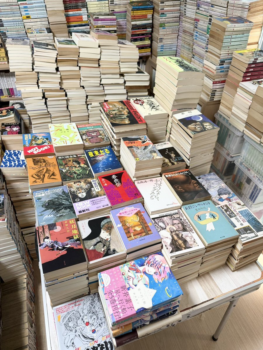 ざっと見渡した限り10年近く、もしくはそれ以上前の本が多いみたい。古本屋さんで購入なのかなぁ。消費税込値段表示どころか下手すると導入前の本もありそう。手前に見える新井素子先生の星へ行く船完全版が出版されたのが2016/9/16でこの中では新しい部類。平井和正先生のコミカライズと並んでて胸熱 x.com/vzlhahj18epuhc…
