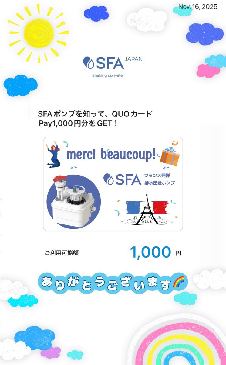 SFA Japan株式会社(@SFA_Japan)様のCPに当選し、QUOカードPay1000円分をいただきました。嬉しいです✨ありがとうございます🍹SFA Japan株式会社様は全世界で累計1000万台以上の排水圧送ポンプの実績があり、世界70か国に水まわりソリューションで人々の快適な暮らしに貢献されています♪ pic.x.com/dYi0tWiS9e