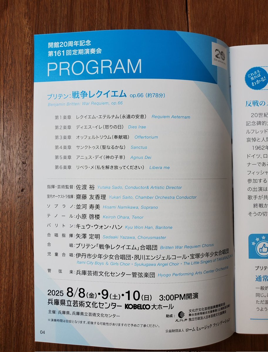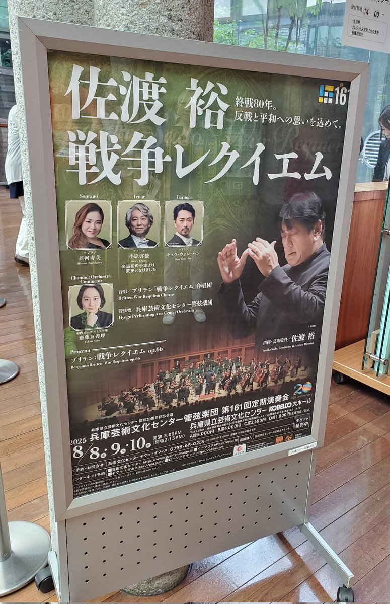 兵庫芸術文化センター管弦楽団第161回定期演奏会「佐渡裕 戦争レクイエム」 会場:兵庫県立芸術文化センター大ホール 指揮・芸術監督:佐渡 裕 ソプラノ:並河 寿美 テノール:清水 徹太郎→小原 啓楼 バリトン:キュウ・ウォン・ハン 室内オーケストラ指揮/齋藤 友香理 合唱指揮:矢澤 定明 pic.x.com/5heFTOdOpa