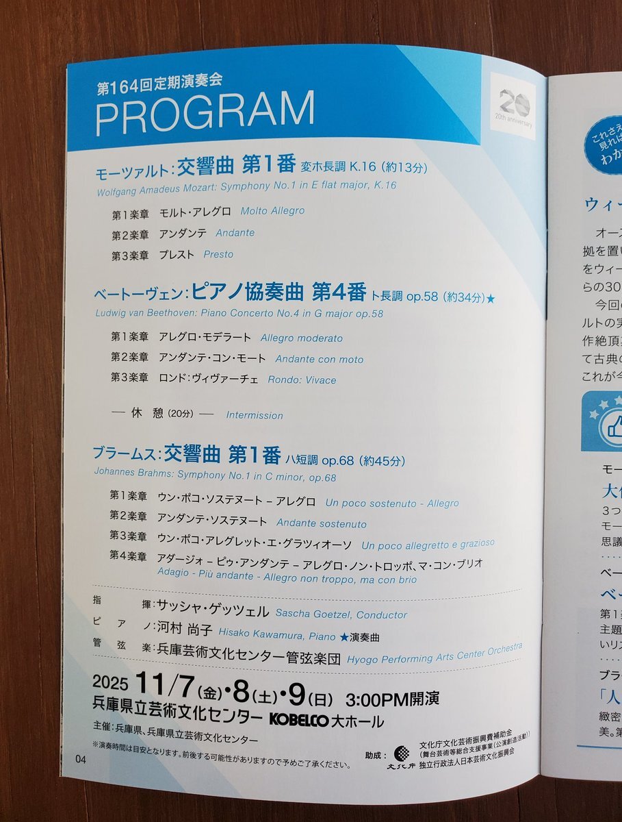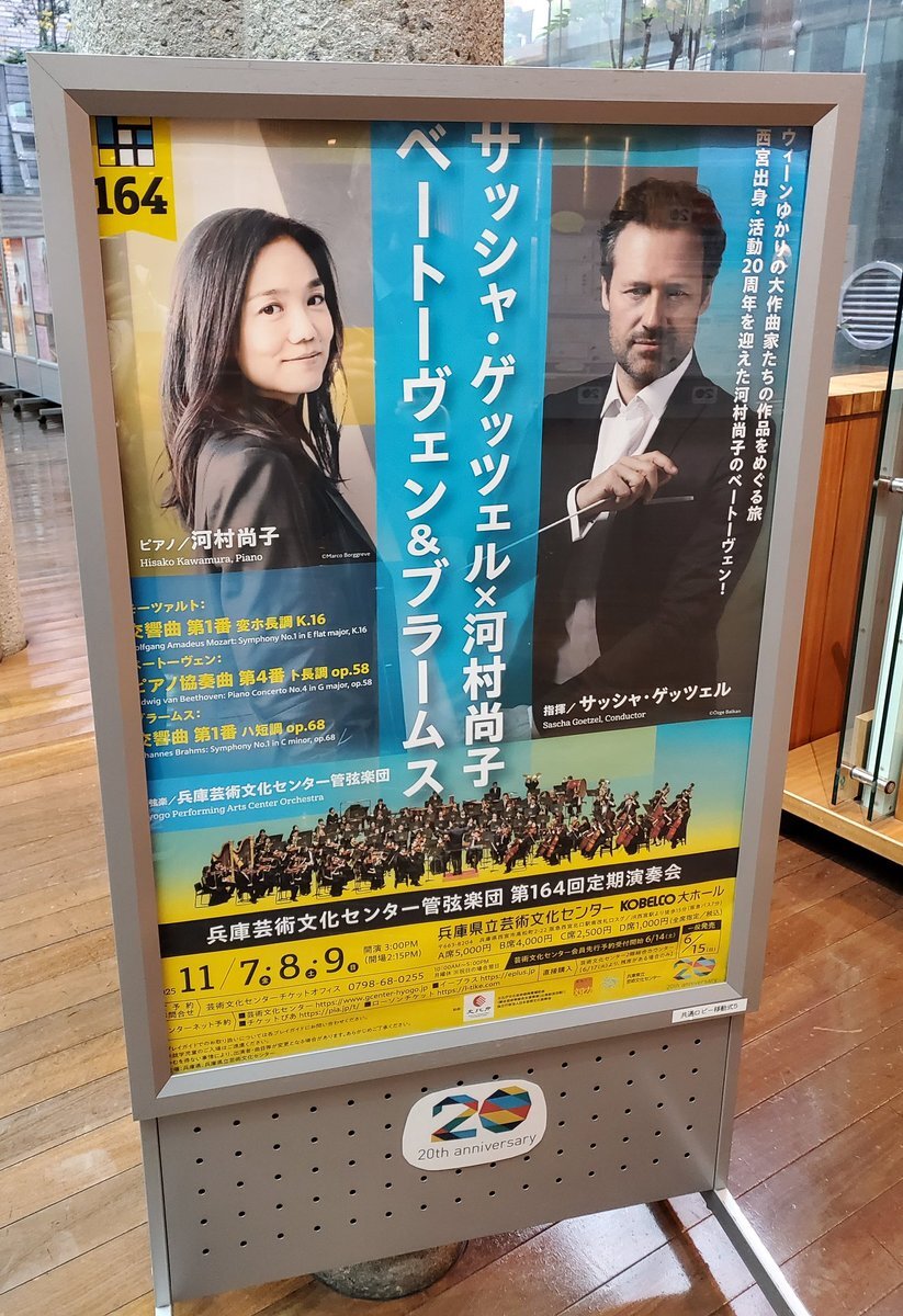 兵庫芸術文化センター管弦楽団第164回定期演奏会 会場:兵庫県立芸術文化センター大ホール 指揮:サッシャ・ゲッツェル ピアノ:河村尚子 曲目: モーツァルト/交響曲第1番 ベートーヴェン/ピアノ協奏曲第4番 ブラームス/交響曲第1番 pic.x.com/617AheVZ4a