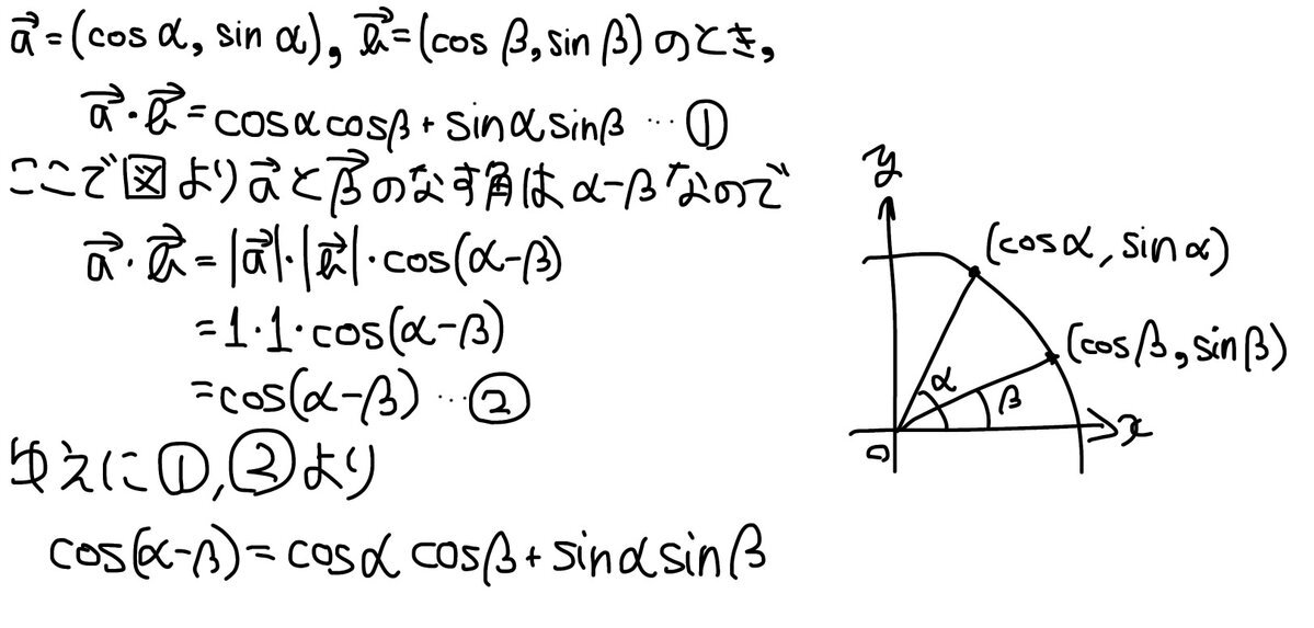 内積計算式(ここで言う2)は余弦定理 余弦定理自体は幾何的に導けるから、循環論法にはならない 内積成分表示の定義はもちろん加法定理を使わないので大丈夫。 x.com/ud0noisi/statu…