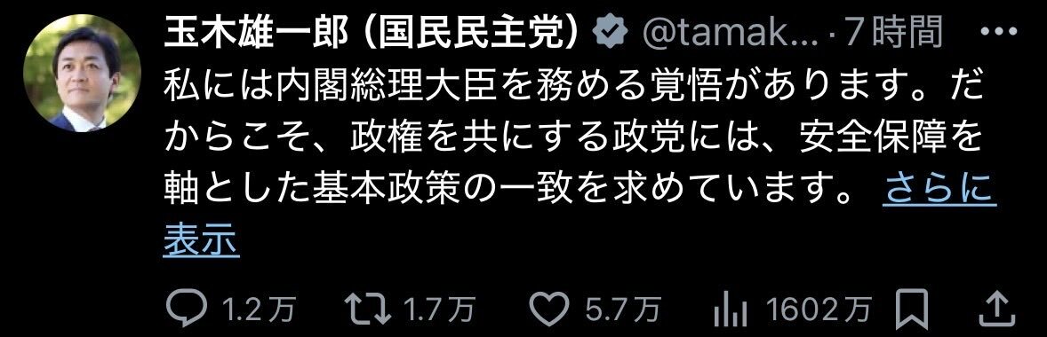 「私には内閣総理大臣を務める覚悟があります。」 「私に内閣総理大臣を務める覚悟があります。」 同じポストでの繰り返し🧐 国民民主議員の首班指名は玉木で揺るがないとして、反高市の皆さんが玉木の名を書くならご勝手に、連立組む確約はしないけどね、というスタンスかな?🤔 どっち転んでもよい