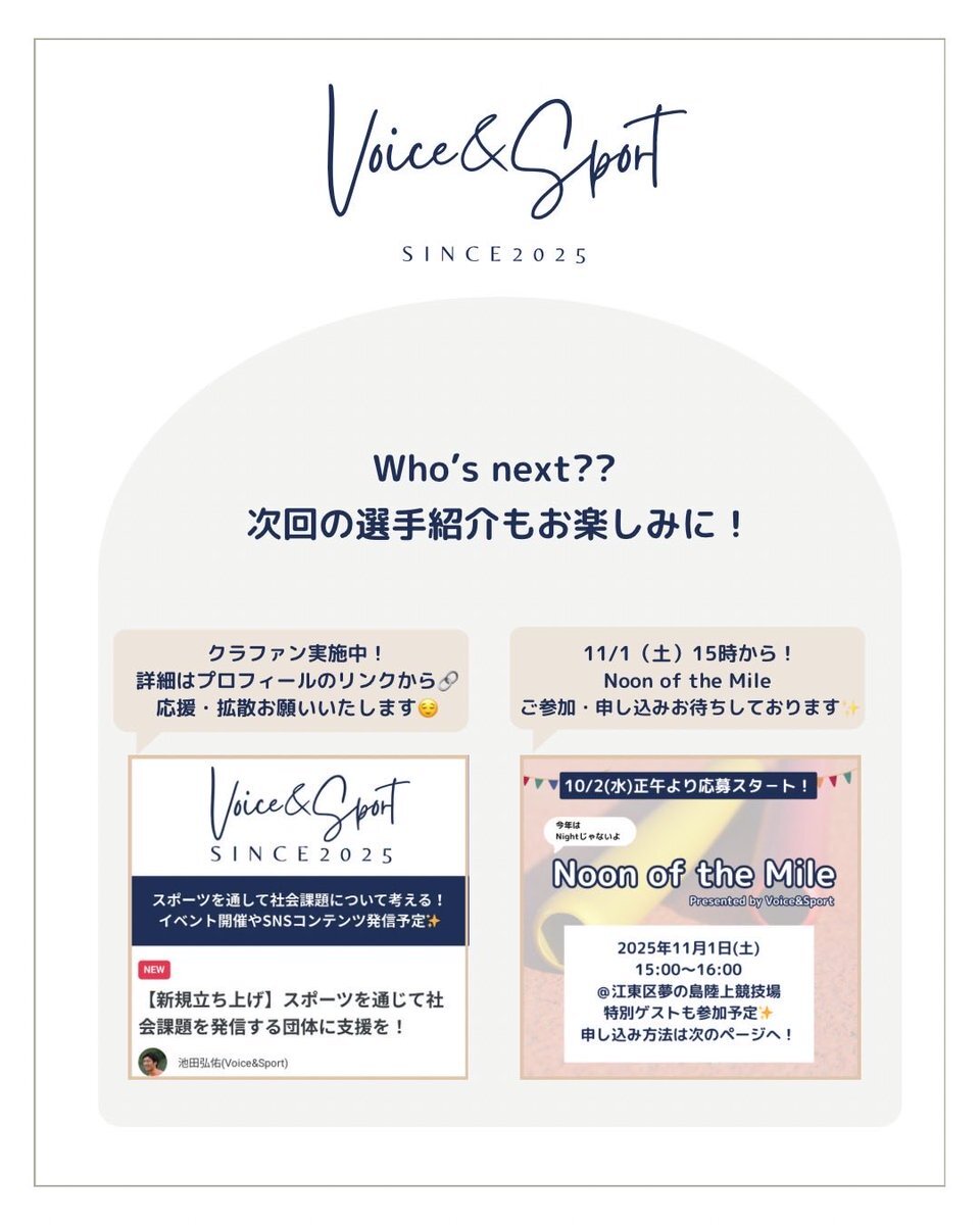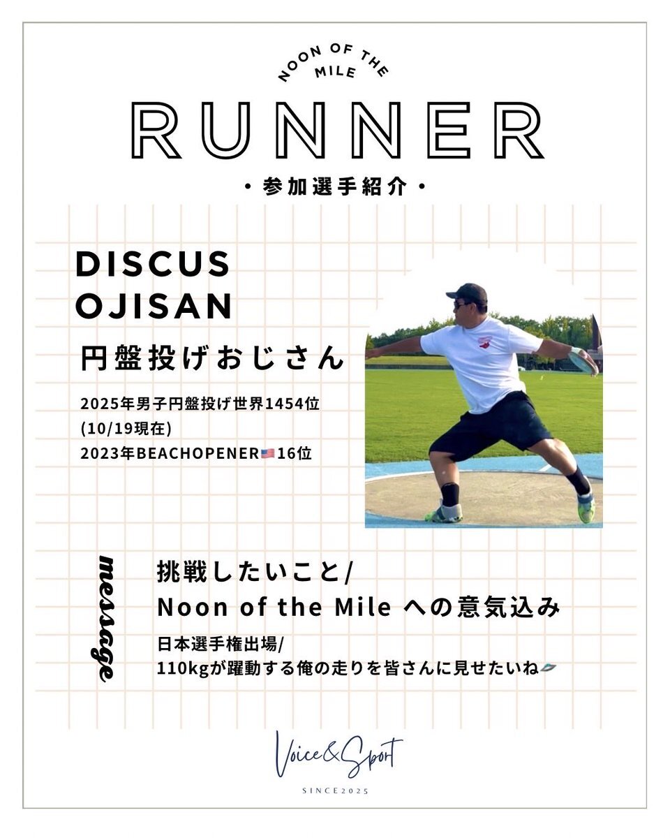 【参加選手紹介②】 11/1(土)に行う、Noon of the Mile に出場する ゲスト選手を紹介します! 2人目はYouTuberとしても活躍中の 円盤投げおじさん@DiscusOjisan です🛸🔥 3人目は誰でしょうか…! 次回のポストもお楽しみに!👀✨ #voiceandsport #noonofthemile #挑戦の力を社会の力へ pic.x.com/CE05VNHS66