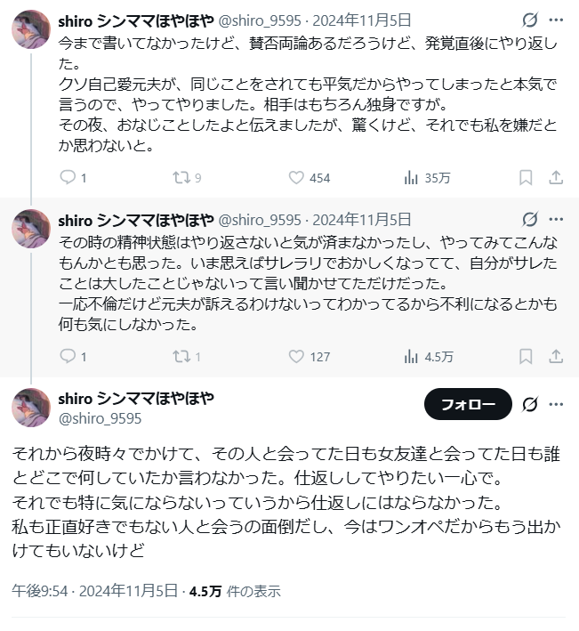 【悲報】しろシンママほやほや、仕返しに自分も不倫する x.com/lfyrbqvvs71888…