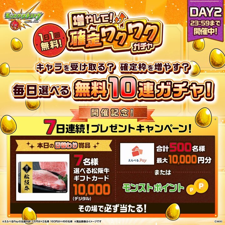 / 増やして!確定ワクワクガチャ開催記念 📢7日間連続CP✨2日目 \ えらべるPayや日替わり賞品🍖等が その場で当たる🎯 1️⃣本アカウントをフォロー 2️⃣ #確定ワクワクガチャはまだ序盤 と「確定枠数の報告コメント」をつけて引用ポスト(11/22迄) 3️⃣👇結果確認 gcp.giftee.biz/@monst_campaig… #モンスト