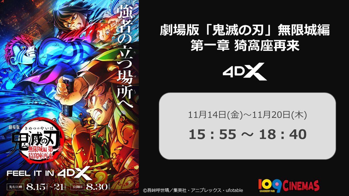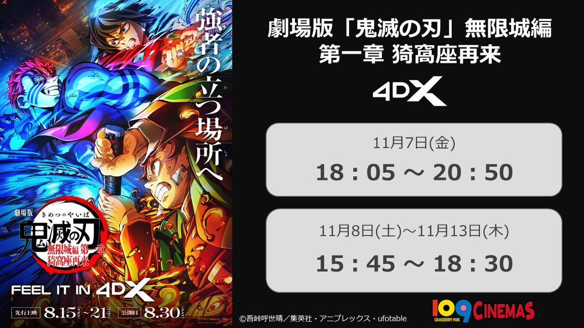 【#無限城編 4DX】 劇場版「鬼滅の刃」 無限城編 第一章 猗窩座再来 4DXで絶賛上映中! 11/7(金)~11/13(木)📅 上映スケジュールが決定いたしました! 4DXで鬼殺隊たちと共に戦いましょう!⚔️ チケットご購入はこちらから🎟️ 109cinemas.net/grandberrypark/ #鬼滅の刃 pic.x.com/nPaGlVxUDq