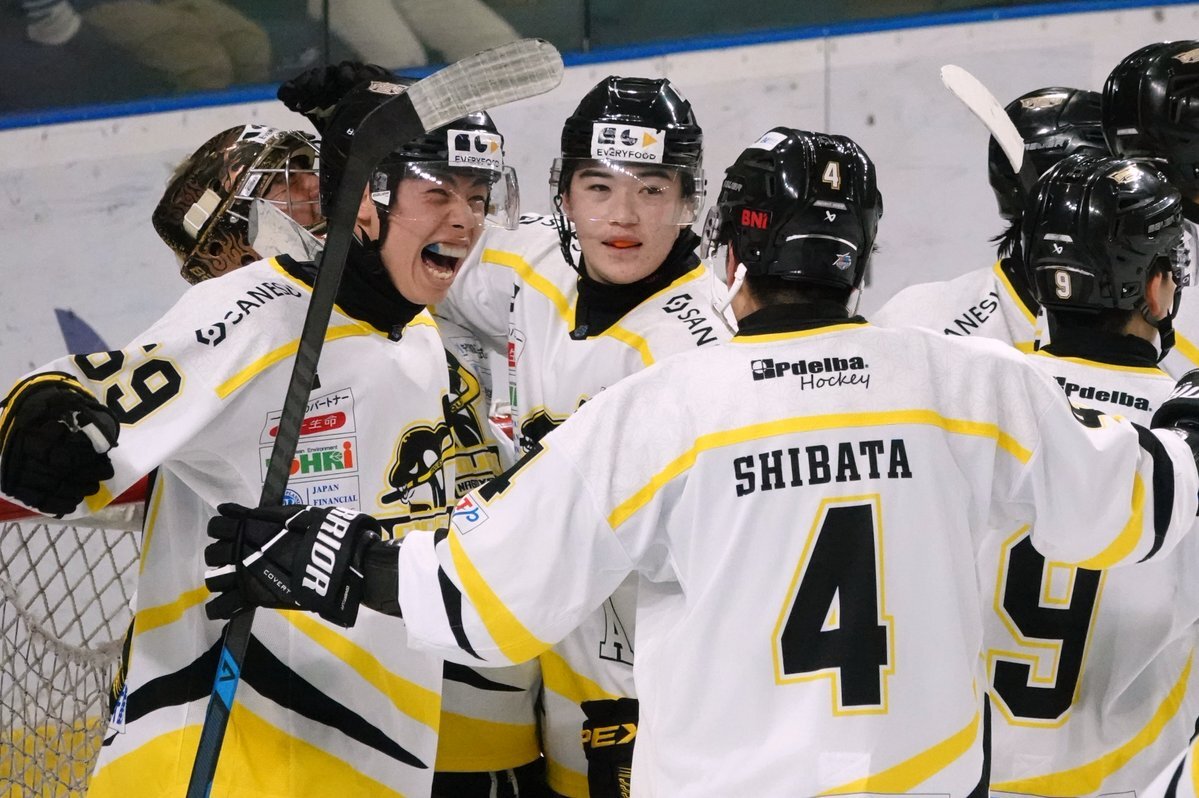 XHLのお写真(12) そしてそのままタイムアップ! GK丹治選手の元に皆が集まりますが,1人大きな口で別次元で喜んでる方がいますね。 たぶん北斗はこのままもんじさんに喰われたんだと思います。 #名古屋オルクス #XHL #丹治 #十文字 #もんじ @Monji_Hockey