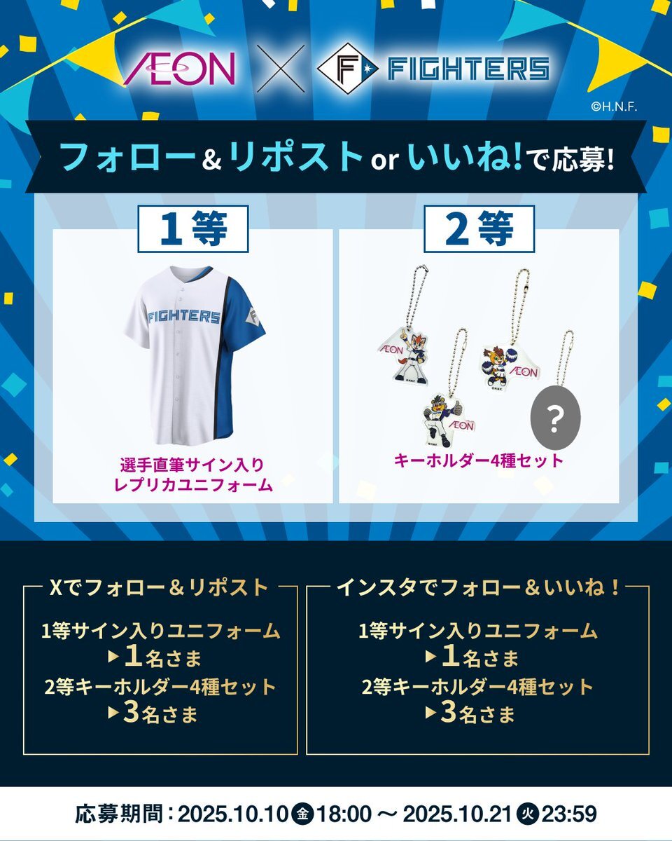 ⚾️✨フォロー&いいねで応募しよう!✨⚾️ イオン北海道 × 北海道日本ハムファイターズ 🎊グッズプレゼント🎊 📅応募期間 2025年10月10日(金)18:00〜10月21日(火)23:59 🎁抽選で4️⃣名さまに当たる!  ̄ ̄ ̄ ̄ ̄ ̄ ̄ ̄ ̄ ̄ ̄ ̄ ̄ ①【選手直筆サイン入りレプリカユニフォーム⚾️】 pic.x.com/50kYjihUBy