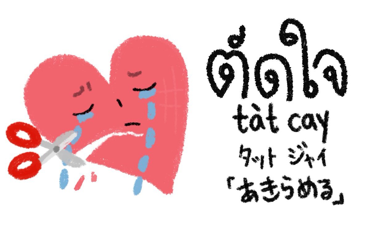今日の #タイ語 🇹🇭 ตัดใจ タットジャイ 「あきらめる」 直訳は「心を切る」ですが、未練はあるけれど現実をみて気持ちに区切りをつけるという意味で使います! 恋愛でよく使われる言葉です💔 例文 💔ยิ่งรักมาก ยิ่งตัดใจยาก yîŋ rák mâak yîŋ tàtcay yâak 好きになればなるほど、手放すのはつらい pic.x.com/2mJRLm3mtv
