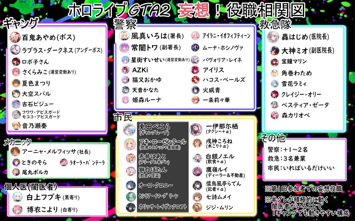 ホロGTAのポストがちらほら見えたので以前の役職表乗せて妄想トーク ホロ内でGTA完結させるなら、まず完全白市民をゼロにし、少なくとも半グレチームを2~3チーム追加(経験者優先 半グレ犯罪で沢山街をにぎやかすことが大事 ファーム・銃などの押収物無し その分罰金を強めて警察に還元 x.com/holosabamatome…