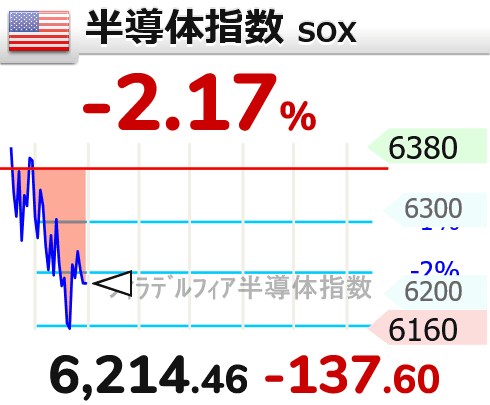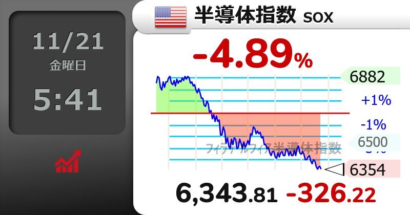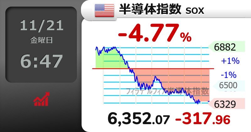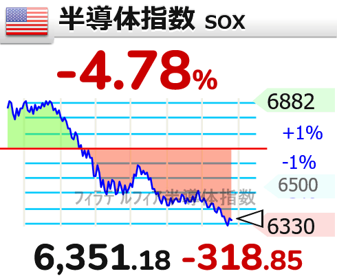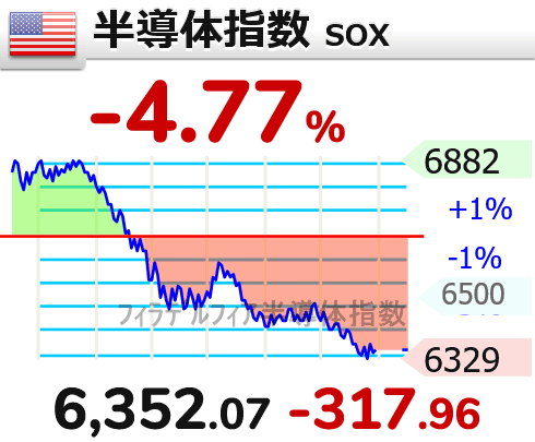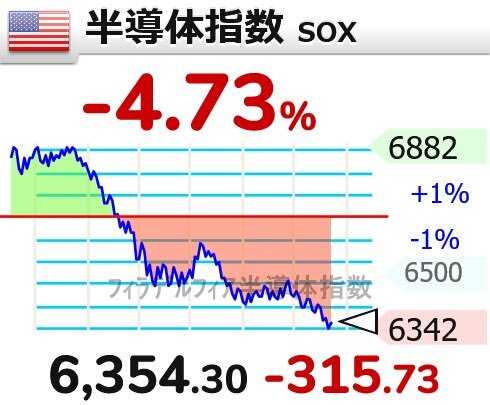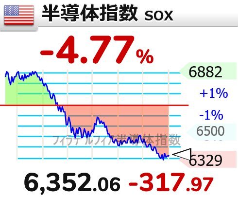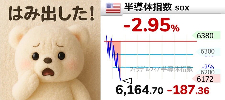 ⤵⤵⤵⤵ 【🇺🇸半導体指数 SOX】-4.77% 6,352.06 (-317.97) 昨日は朝から半導体やAI関連株に大はしゃぎの雰囲気でしたが、早見は一切飛びつかせませんでした。結局昨日はキオクシアやSBG、フジクラなど寄り天パターンでしたが、案の定厳しい空気になっています。 pic.x.com/4B9j89XDRZ