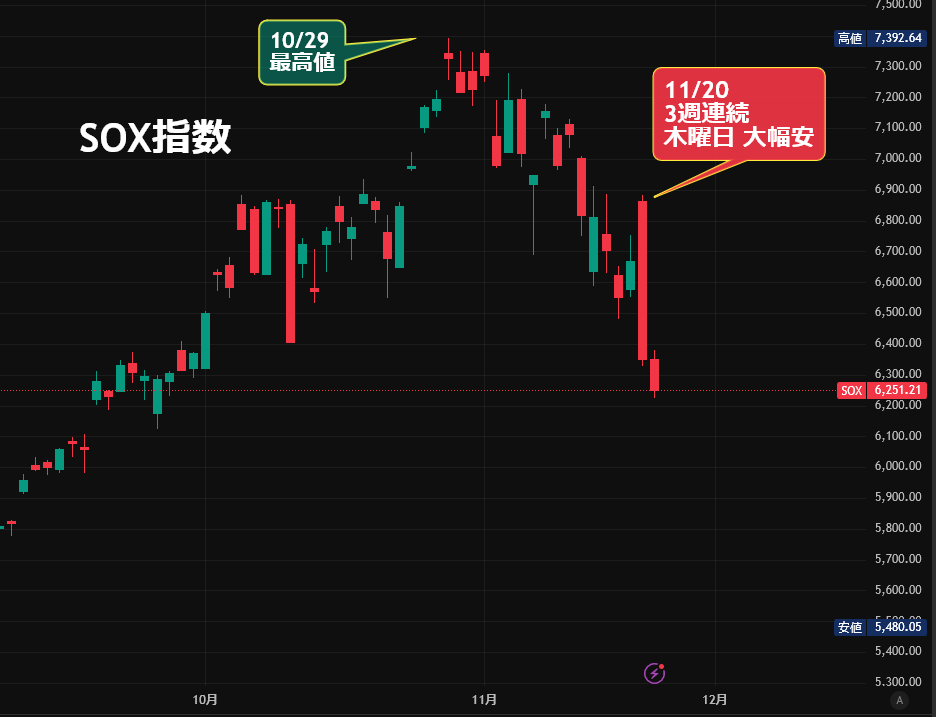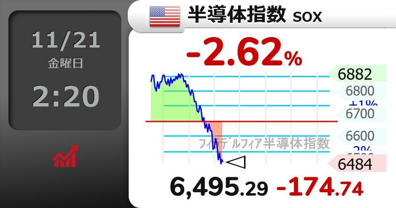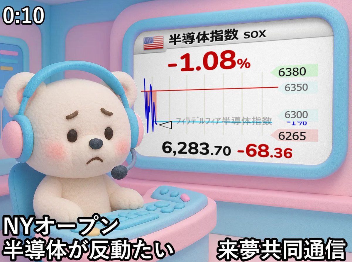 ⑤ 背景② テック・半導体の激しい往復ビンタ👐 ・PHLX半導体指数(SOX):6,352(▲4.8%) 前日終値6,670に対し、 寄り〜前場高値:6,883(+3%前後) 引け:▲4.8% → 1日の中で「+3% → ▲4.8%」と、約8ポイントぶん振り回される凄まじいボラ🎢