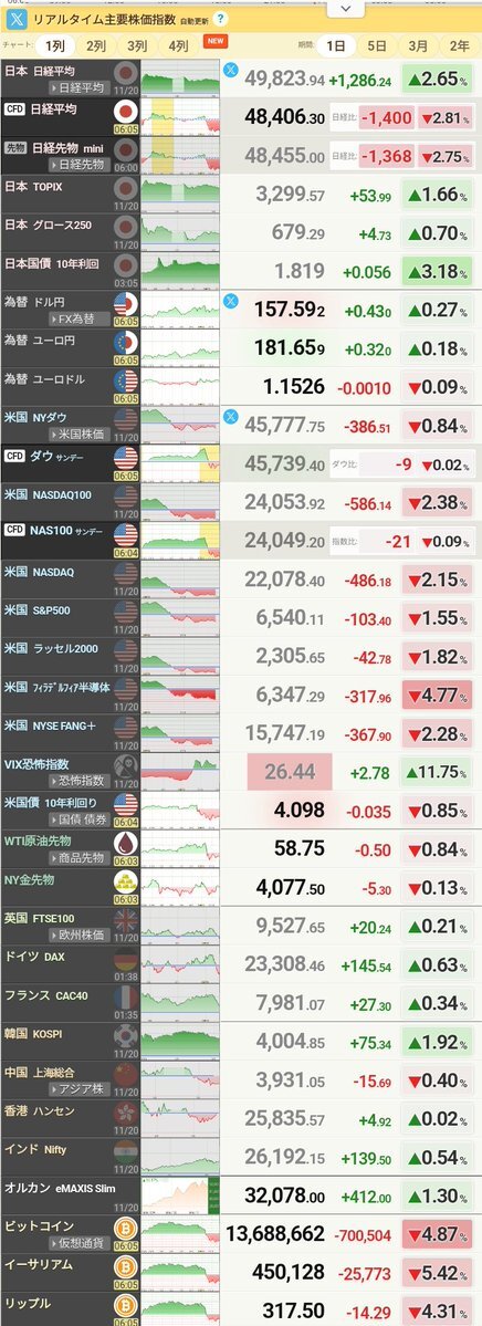 11/21 おはぎゃーございます。 今朝の状況確認です。 🟠日経CFD 48,406.30(-1,400・-2.81%) 🟠ドル円 157.59(+0.43・+0.27%) 🟠NYダウ 45,777.75(-386.51・-0.84%) 🟠NASDAQ 22,078.40(-486.18・-2.15%) 🟠S&P500 6,540.11(-103.40・-1.55%) 🟠フィラデルフィア半導体指数(SOX) pic.x.com/g2MpBla42Z