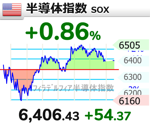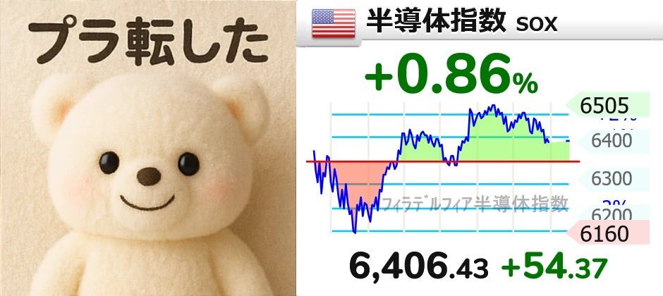 ⑥ 半導体・ハイテク❶:SOXとセクター全体💾 ・PHLX半導体指数(SOX):6,464前後(+約1.8%) 前日の▲4.8%急落のあと、さすがに売られすぎ感からの買い戻しかな。 とはいえ前日の下げを埋め切るには至らず、「一旦下げ止まり」の段階という感じです!