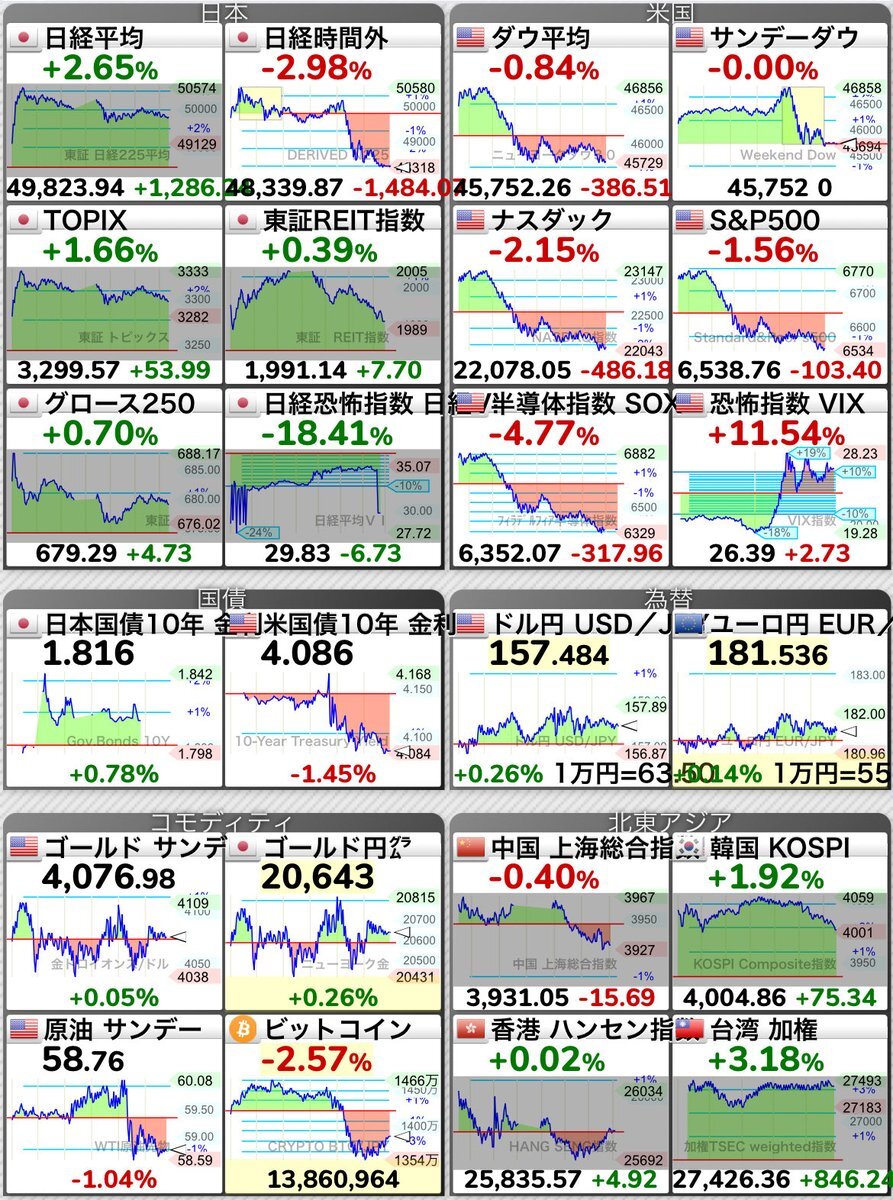 【🇯🇵日経時間外 】-2.98% 48,339.87円 (-1484.07) 日経500円の下落かと思いきや、1,500円の下落。昨日の上げはそっくり消してる。ちょいおはぎゃー。 【🇺🇸半導体指数 SOX】-4.77% 6,352.07 (-317.96) SOX4.77%下落は結構な幅。 エヌビディア、上げからの下落。 pic.x.com/rob4KXgi4W