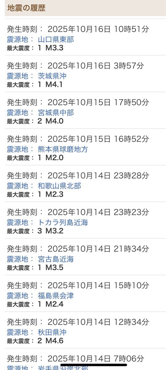 有感地震10:51 9/26-27 24時間有感地震なし 9/30フィリピン付近M7.0 10/5福島県沖M5.7 10/10フィリピン付近7.4 10/11南米中部M7.8 2025年10月16日 10時51分 山口県東部 最大震度1 マグニチュード3.3 深さ60km から、24時間有感地震なし pic.x.com/6S4IWC6PEx