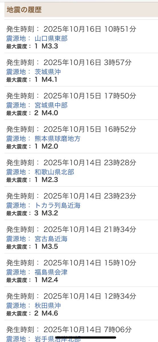 有感地震12:50 9/26-27 24時間有感地震なし 9/30フィリピン付近M7.0 10/5福島県沖M5.7 10/10フィリピン付近7.4 10/11南米中部M7.8 10/16-17 24時間有感地震なし 10/19 トカラ列島近海群発中← pic.x.com/fxI8JAgK4i