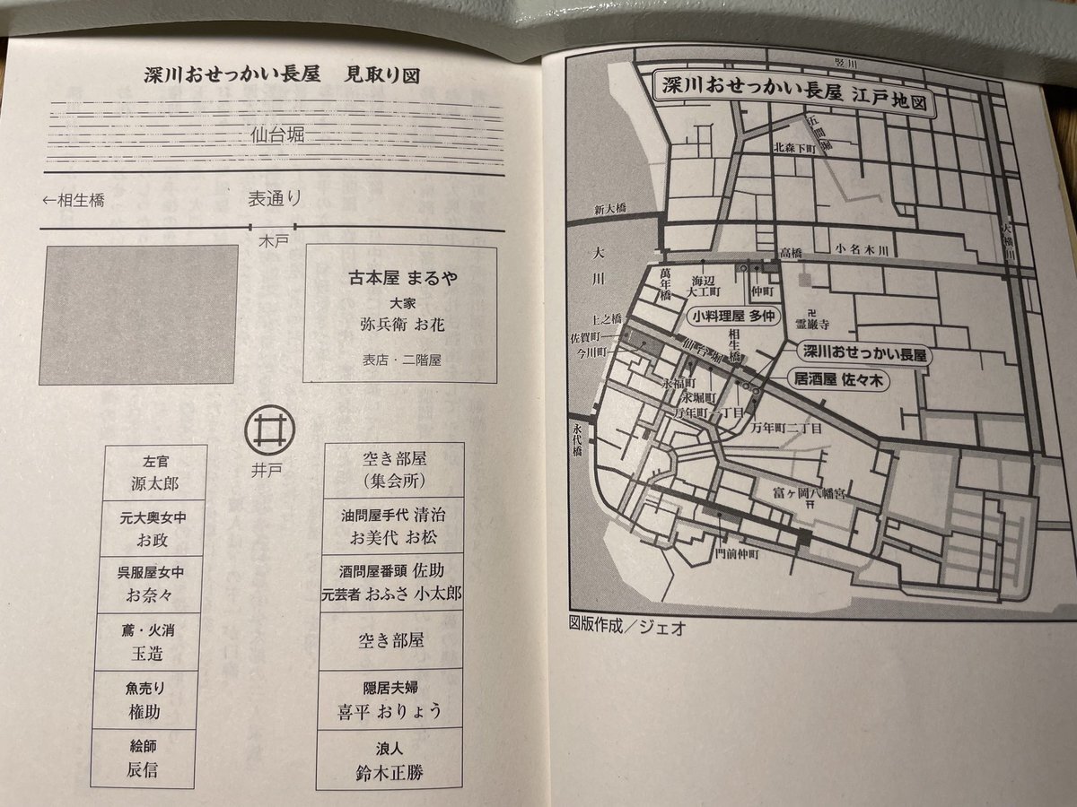 そして地図と長屋の部屋割り図がついてる!これがあるとないでは、おもしろさが全然違う。しかも一分銀(約2万5千円)という感じで、お金や時刻、長さなどにすべて現在単位換算がついてるのが地味だけどありがた過ぎでポイント高し! pic.x.com/e247jcvOAF
