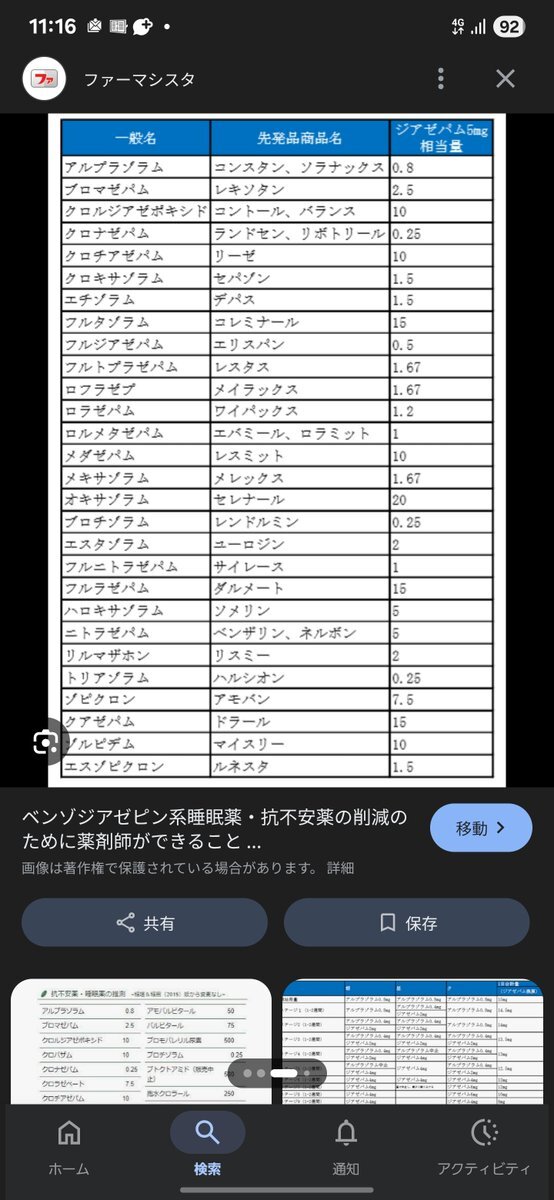 返信先:@cinnamonbark500エチゾラム0.5mgを5回(2.5mg/日)飲めば、何とか痛みがコントロールできるのですよね。でもご存知のようにその量を飲み続けるのはまずいですよね。ベンゾ力価換算表によるとその量はセルシンで約8.3mg(ラなら約0.42mg)に相当します。それらに変更して年単位で減薬するのもありかなと思いまして。 pic.x.com/lf50dyeuwW