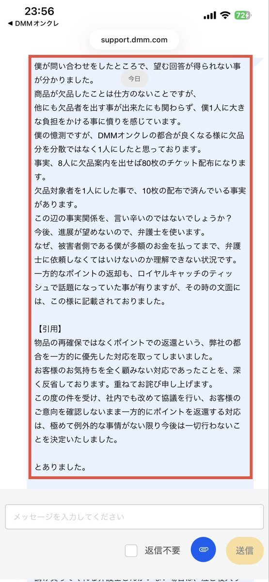 DMMオンクレの欠品について… 問い合わせ内容に関しての回答は、また頂けませんでした… 回答を得るために弁護士を使うと、おそらく100万単価のお金が必要になります? 僕は、何も悪い事をしていないのに… 100万単価のお金で死んでしまう人だっているんですよ…💢 #DMMオンクレでゲット #欠品