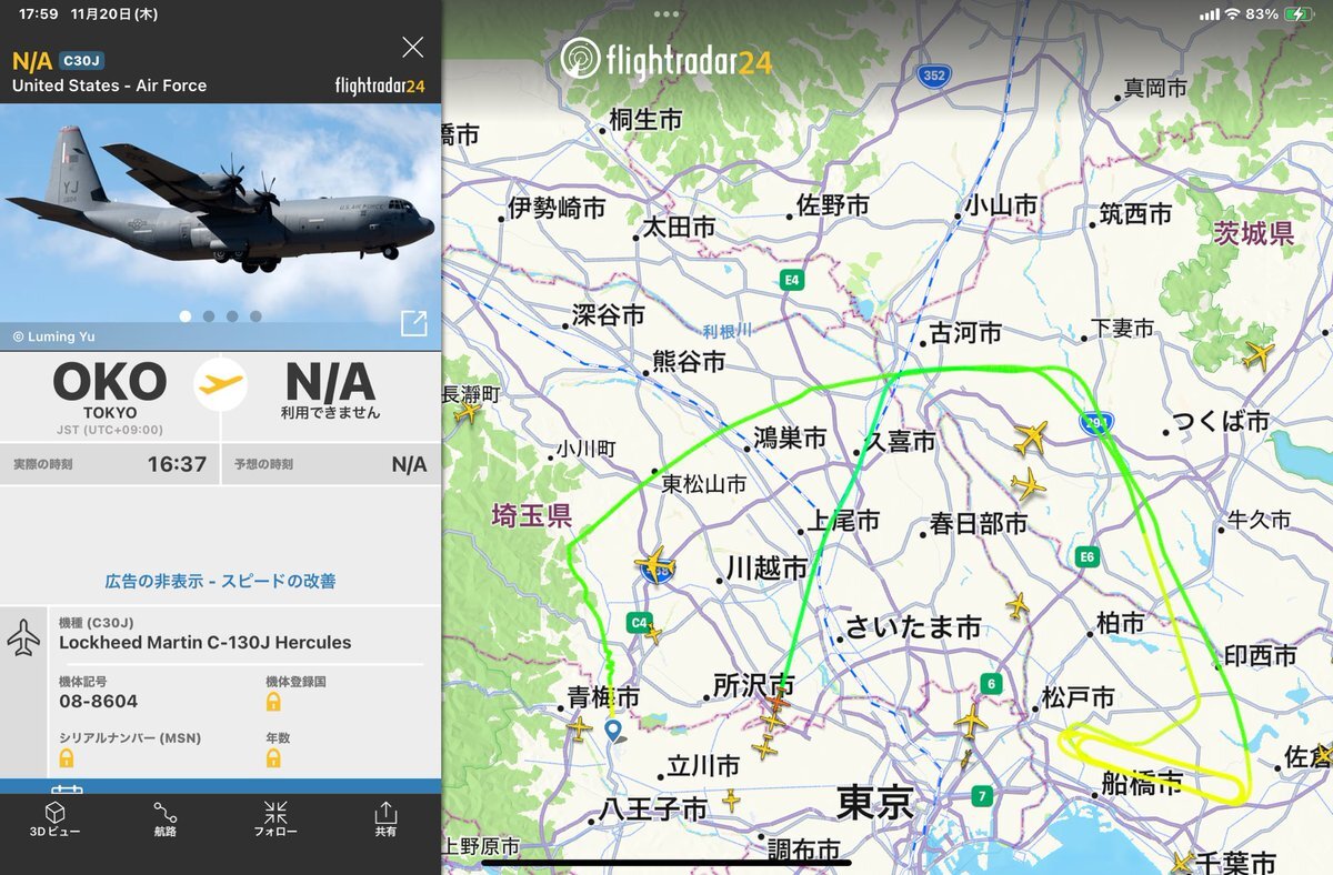本日11/20の習志野演習場における米軍機からの第一空挺団の降下訓練は17時3分に1周目の3機(C130J)飛来後、17時14分、17時25分、17時36分と4周で終了したもよう。 降下人数の総数は不明。