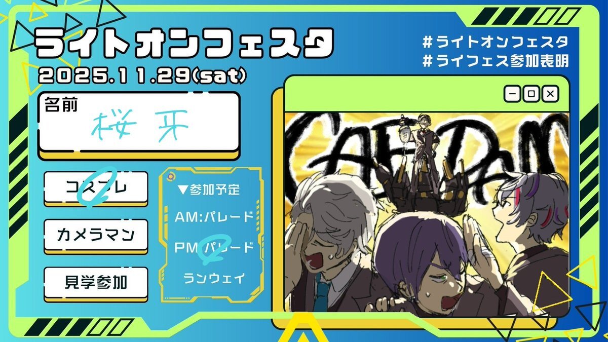 ライフェスは🌞でいます 12番目CAE-DAM(カエダマ)でパフォ参加いたします お時間ある方見に来ていただけたら嬉しいです!! そして、PMパレードもお手伝いで参加させていただきます よろしくお願いします 参加表明はこまちちゃんが作ってくれました✨️ #ライフェス参加表明 #ライトオンフェスタ pic.x.com/P4AVjzh4tj