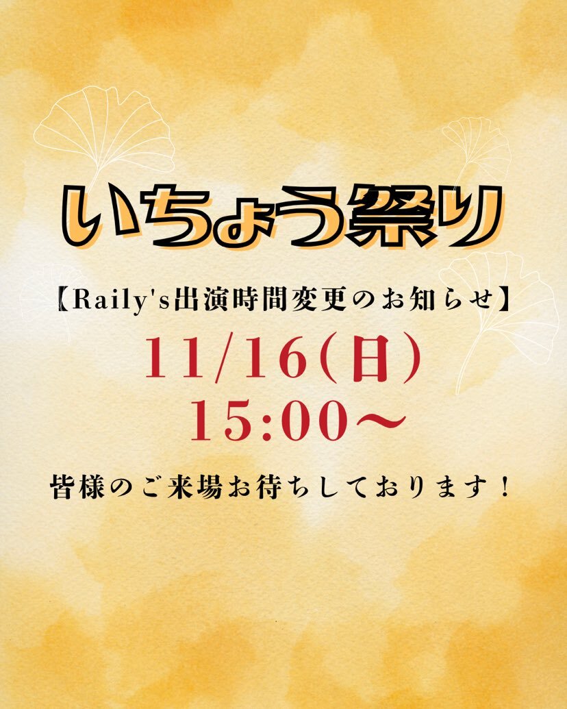 おはようございます☀️ 昨日から開催されている いちょう祭り! 本日は私たち Raily’s も参加させていただきます✨ 本日の出演時間は 15:00〜 に変更となっており、 その後 15:30〜 の閉会式にも参加いたします! 皆さまのご来場お待ちしております😊 どうぞお気をつけてお越しください💛 pic.x.com/tV0LYfo21m x.com/raily_s/status…