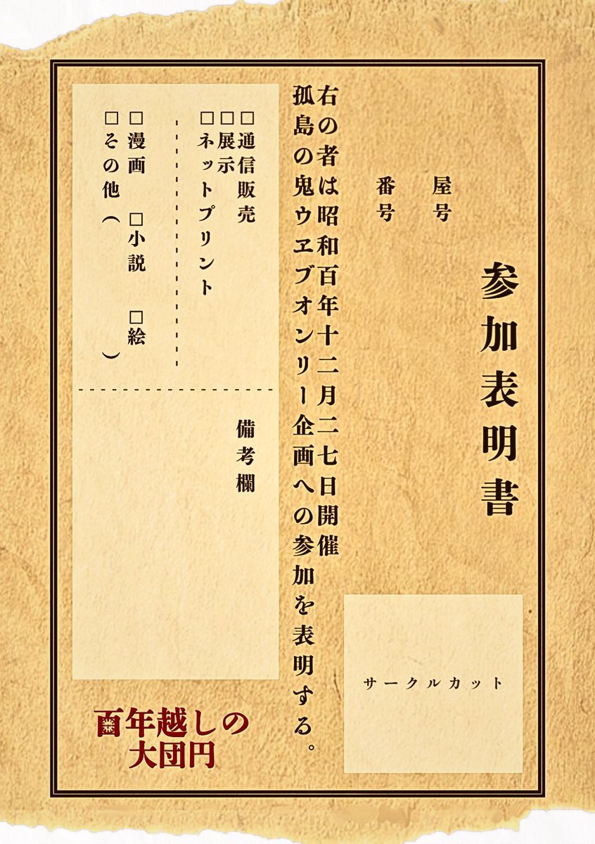 📢お 知 ら せ 参加表明書、遂に成る! 本企劃への参加表明書雛形、此度完成致候。参加を表明せんとする方々におかれては、所定の項目を御記入の上 「#百年越しの大団円 」を添へて御投稿下されば幸甚に存ず。記入法は次投稿をご参照されたし。 引き続き皆々様の御参与を心よりお待ち申し上ぐ。 pic.x.com/PMZnNNGXi1