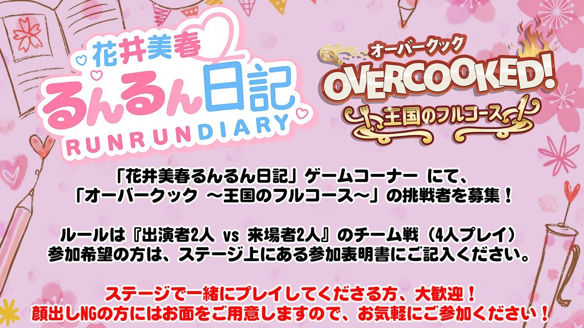 🎮✨ご来場の皆さまへお知らせ✨ 17:30開演 『花井美春 るんるん日記 イベント』ゲームコーナーでは「オーバークック」の挑戦者を募集します🔥 出演者2名+来場者2名のチーム戦!参加をご希望の方は、なるべくお早めにご来場のうえ、ステージ上の参加表明書にご記入ください🎉✍️ #るんるん日記 pic.x.com/6WJEOCtj6P