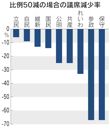 議席減少率の格差がない形で減らすのがマスト。それ以上に「新しい芽が出てくるチャンスを潰す」という新しい政党の新規参入を阻止しない形で制度設計しないと、いつまでも自民と立憲を実力以上にのさばらせて国益を害する/議員定数削減、衆院比例50減なら参政や保守は1議席にnikkei.com/article/DGXZQO…