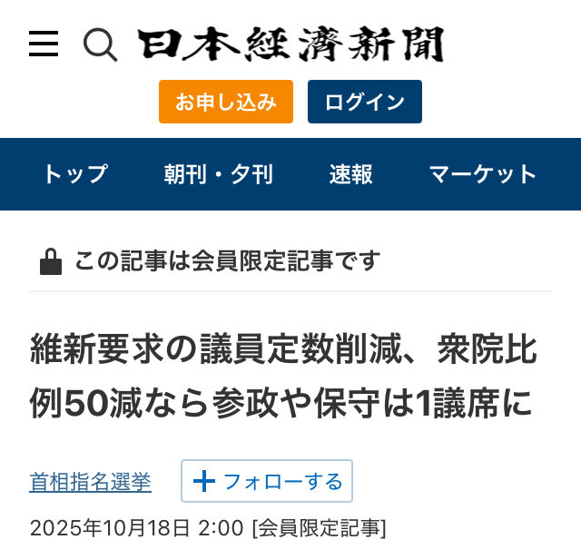 有料記事だから全部読めないけど、参政や保守は比例選出の議員が多いから特に目減りしちゃうのね 日本維新の会要求の議員定数削減、衆院比例50減なら参政や保守は1議席に - 日本経済新聞 share.google/7Zpy78ZWkE6dGE…