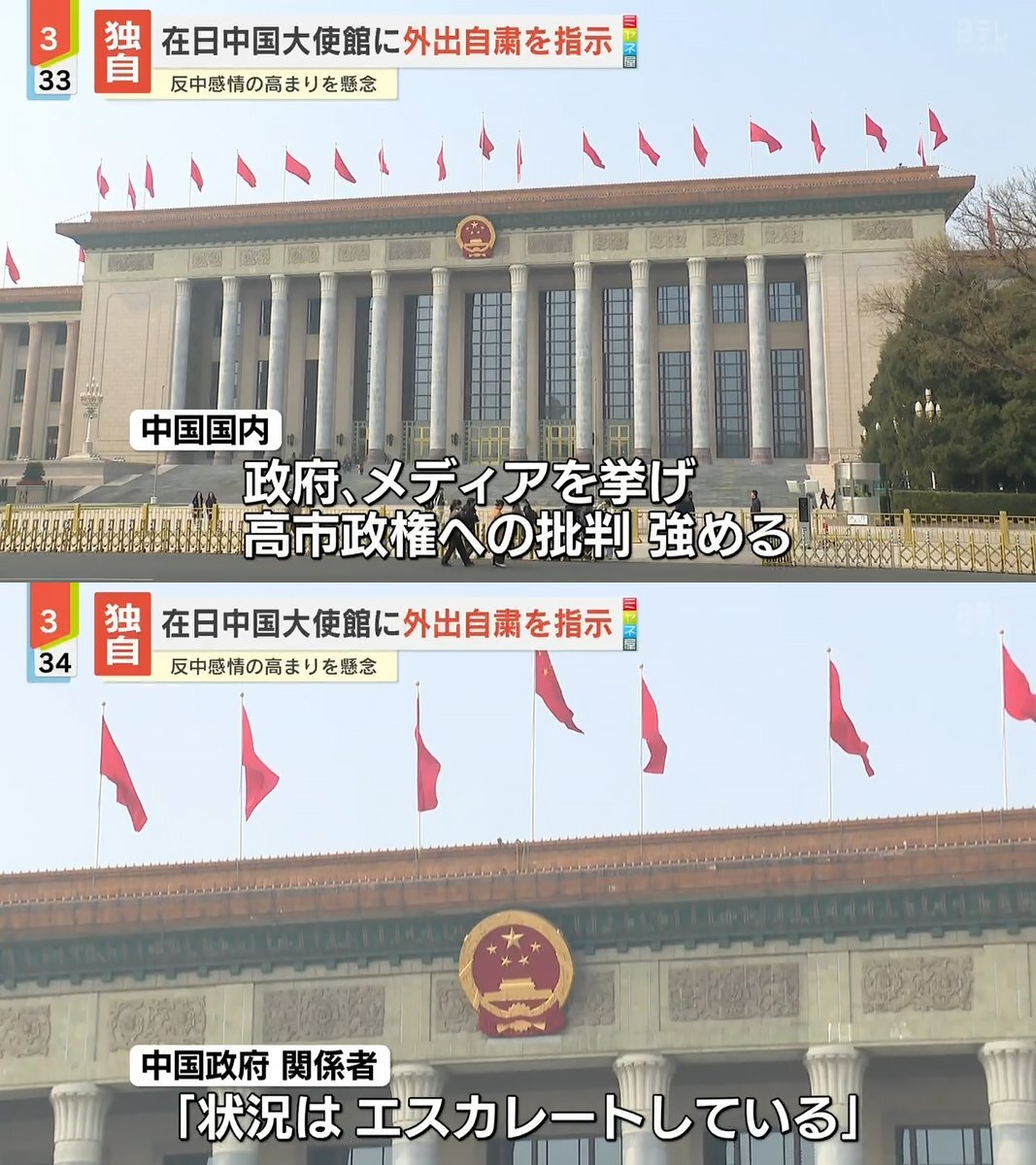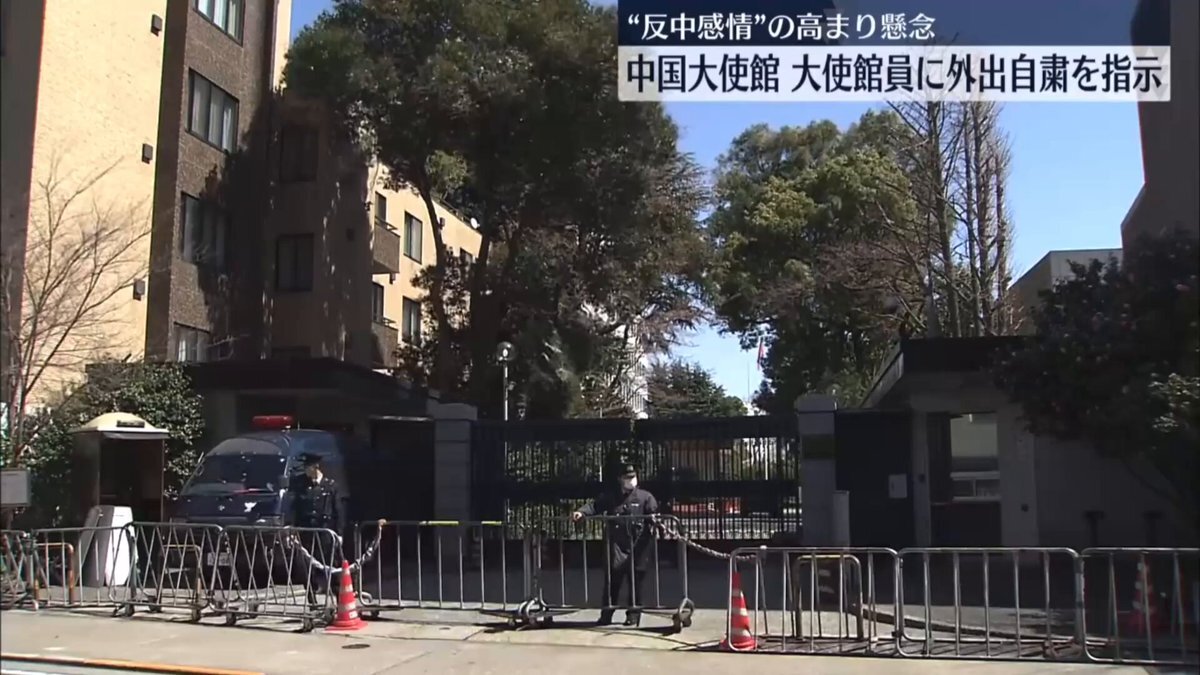 【中国大使館員に外出自粛指示】高市早苗総理大臣の台湾有事をめぐる発言で、日本にある中国大使館では反中感情の高まりを懸念して、大使館員に外出を控えるように指示。 中国国内では、政府・メディアを挙げて高市政権への批判を強めていて、中国政府関係者「状況はエスカレートしている」と懸念。