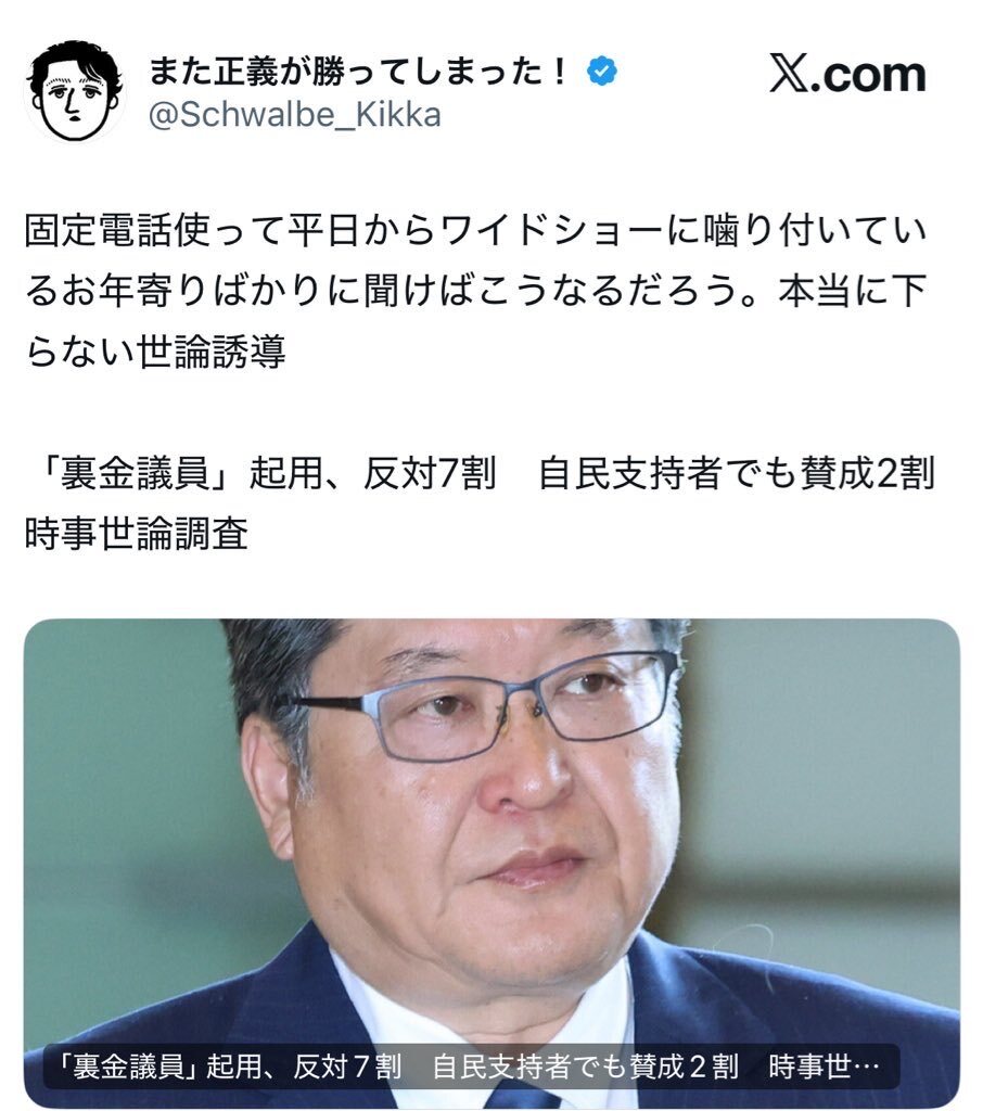 「支持率下げてやる」でお馴染みの時事通信 #時事通信 「裏金議員」起用、反対7割 自民支持者でも賛成2割 時事世論調査(時事通信) #Yahooニュース news.yahoo.co.jp/articles/5e1f3…