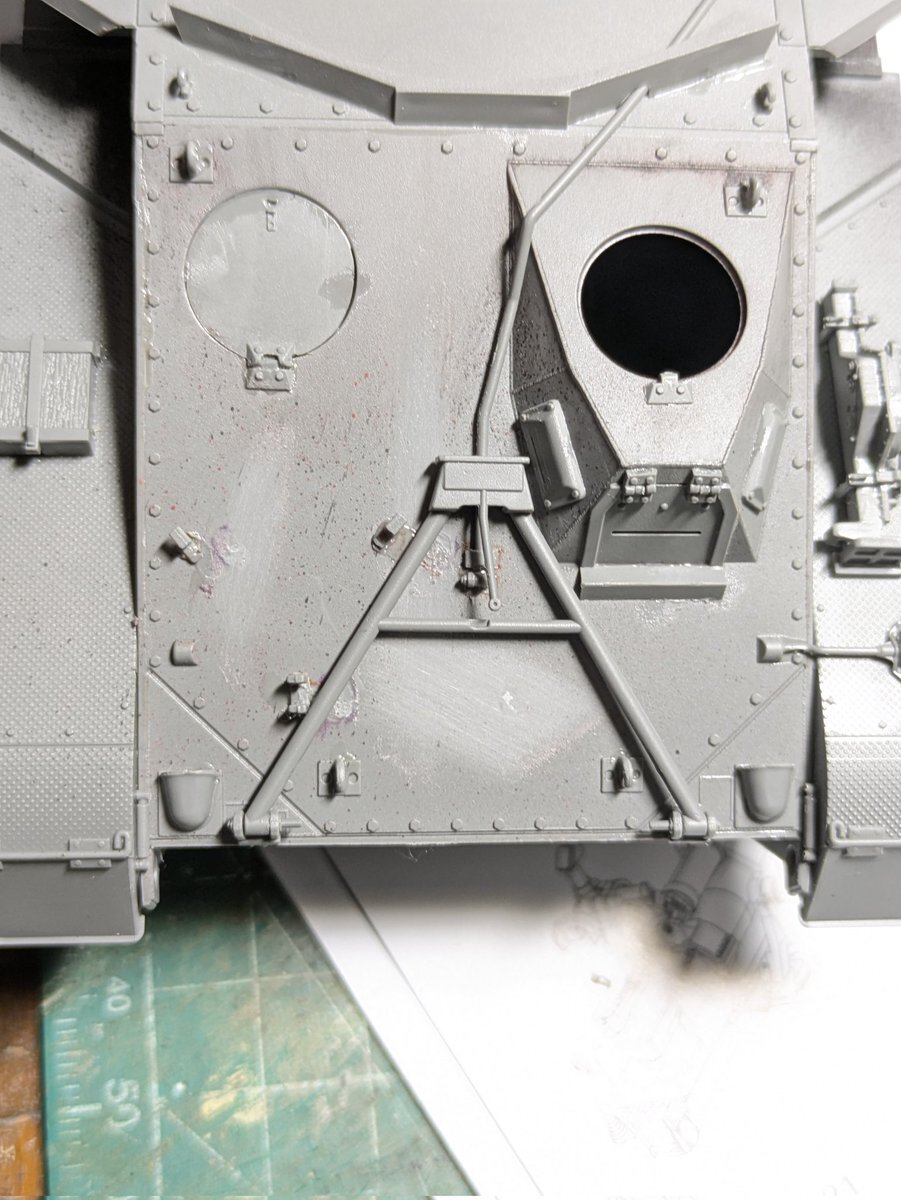 こん(;・∀・) 細々したもの接着中車体正面のロープ取り付け金具の位置が2種類有るのが気になり両方付けてみましたが後期型トラベリングロックでは両方接触する事が発覚 実物もテキトーな位置ですが初期型を改良した物などを除き後期型では接触しない位置に有ることが多い印象なのでズラしました pic.x.com/gvz7Ke66gI