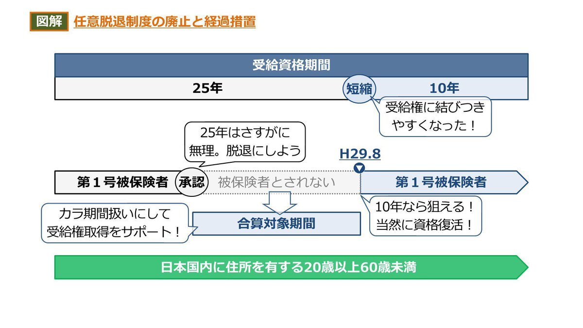 正解はC「合算対象期間」 国民年金の任意脱退には2種類ある。 ・旧国民年金法の任意脱退(都道府県知事の承認)←昭和60年改正の際に廃止 ・短期在留外国人向けの任意脱退(厚生労働大臣の承認)←受給資格期間を10年に短縮する改正の際に廃止 脱退していた期間は、いずれも「合算対象期間」となる。 pic.x.com/OQ0mTCB2BG