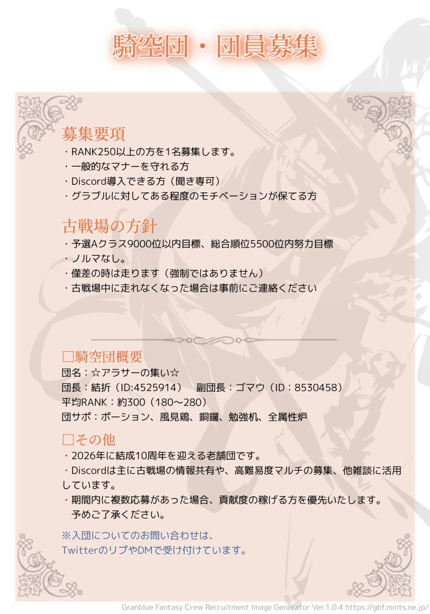 ☆アラサーの集い☆では現在、団員を募集しています。 ◆条件 ・Discordが使えて古戦場そこそこ以上に走れる方 ◆古戦場目標 ・総合順位5500位 ◆定員 ・1名 要項詳細と過去実績は画像をご覧ください。 皆様のご参加をお待ちしております #グラブル団員募集 #団員募集