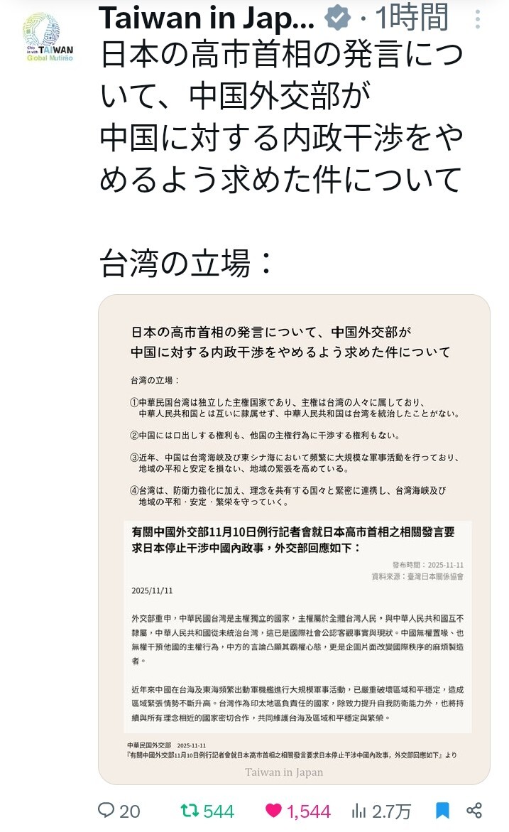まず、殆どの国は台湾は中国の一部と認識していて、台湾と外交関係のある国は僅か12カ国のみ。日本ですら台湾とは民間ベースの交流は有るが外交関係はない。 つまり台湾問題は中国の内政問題だというのが、世界の共通認識。高市氏の発言が内政干渉でないという理屈が認められる訳はありません。 x.com/nihon_koutei/s…
