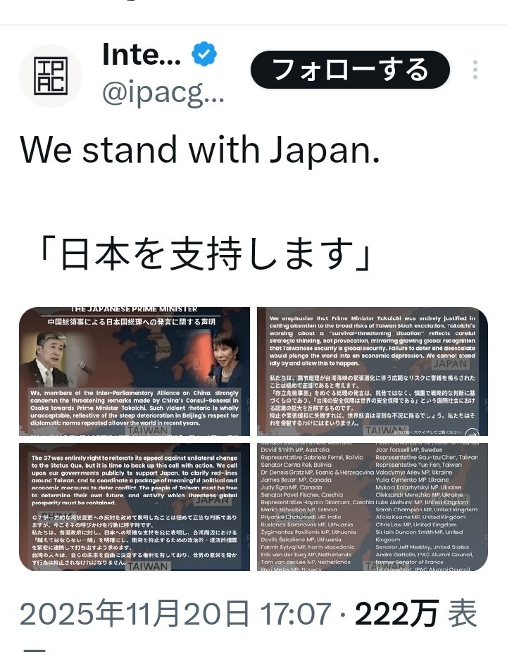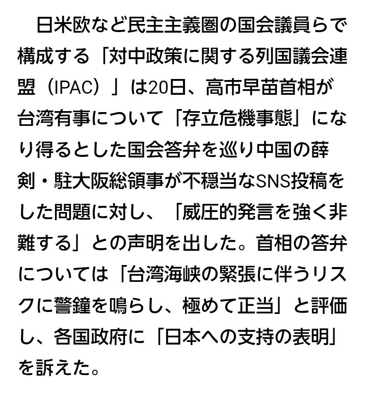 台湾問題は 中国の内政問題』 これは🇨🇳の方の主張ですよね。 一方台湾は、 『中華人民共和国が 台湾を統治した事はない』と明言。 仮にも🇯🇵の首相をされた方なら、片方の主張を鵜呑みにしないで下さい。 因みにIPEC(民主主義諸国の議会連盟)の 『高市発言は極めて正当』との声明はご存知ですか? pic.x.com/31bkU0qEBp x.com/hatoyamayukio/…