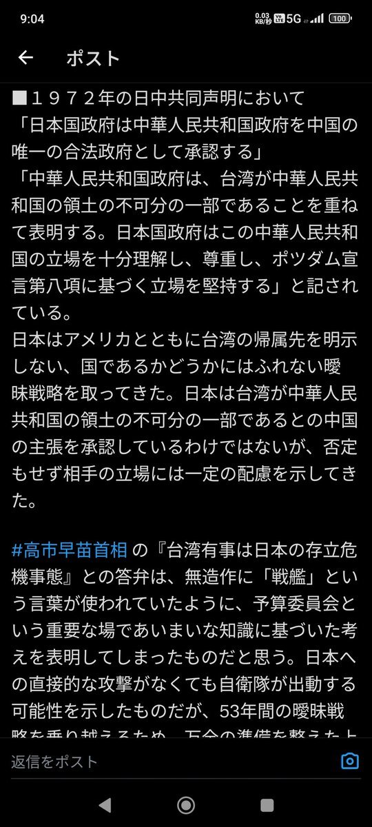 返信先:@hitotyoutyouzin1台湾問題は中国の内政問題であるという認識(日本政府が締結した条約や答弁から)であり、高市早苗発言は致命的ミスである(日本政府・台湾政府・北京政府の最善策は現状維持)という認識(この辺りはみなさんと違う)ですが、このような勘違いした中国人には説教をする必要があります。