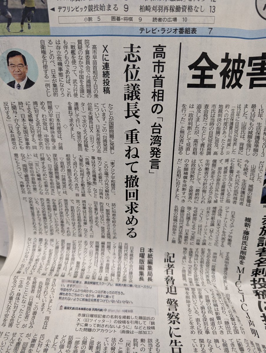 今日の赤旗1面、高市首相「台湾問題発言。 志位議長がXで発言撤回を求めました。 まず党として武力行使や威嚇に反対する立場で外交解決の必要性と危機を煽り大軍拡する動きを批判。 また「台湾発言」は深刻な国際問題に発展しているとして外交的常識が欠如していると批判しました。 #日本共産党 pic.x.com/iKdBskCH2Q