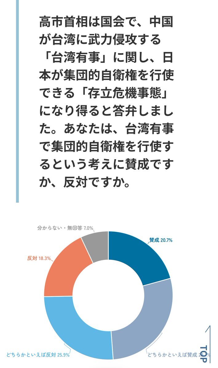 こんな質問、なんとなく高市総理支持してて集団的自衛権よくわかってなければ「どちらかといえば賛成」にしちゃうと思う。 それで「どちらかといえば賛成」も含めて「【速報】台湾有事での集団的自衛権行使に賛成48%」てタイトルにしたのが問題。 pic.x.com/m0T0nIMhqS x.com/livedoornews/s…