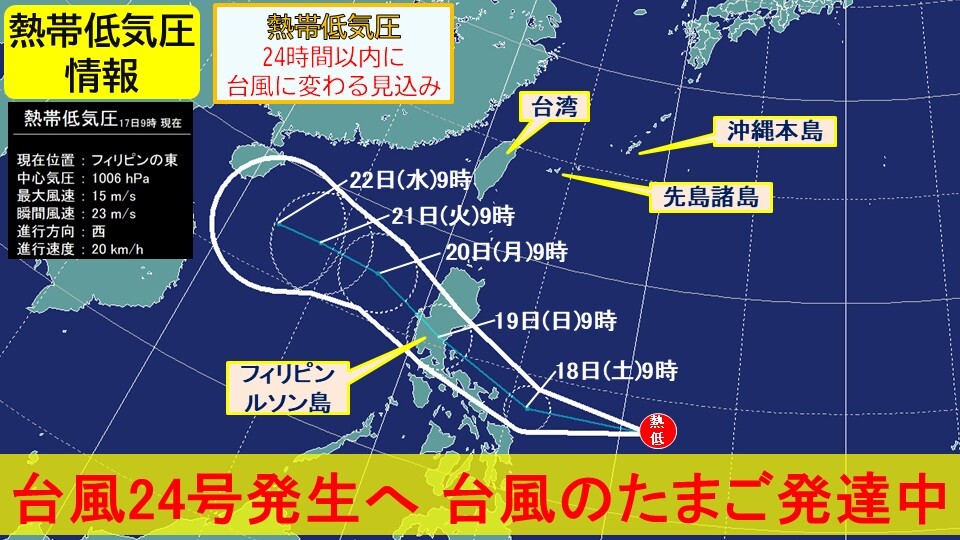ほう まだ台風来る 【台風情報】台風24号に続き「熱帯低気圧=台風のたまご」発生 沖縄の南を南下 日本の南に「秋雨前線」が停滞→今週末にかけての天気はどうなる?気象予報士が詳しく解説【22日午後9時更新 気象庁 雨風シミュレーション】(RSK山陽放送) #Yahooニュース news.yahoo.co.jp/articles/9ba1b…