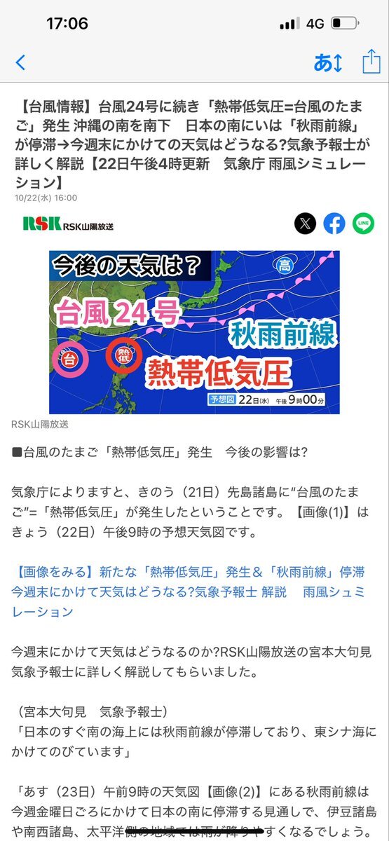 【台風情報】台風24号に続き「熱帯低気圧=台風のたまご」発生 沖縄の南を南下 日本の南にいは「秋雨前線」が停滞→今週末にかけての天気はどうなる?気象予報士が詳しく解説【22日午後4時更新 気象庁 雨風シミュレーション】(RSK山陽放送) news.yahoo.co.jp/articles/f1c36…