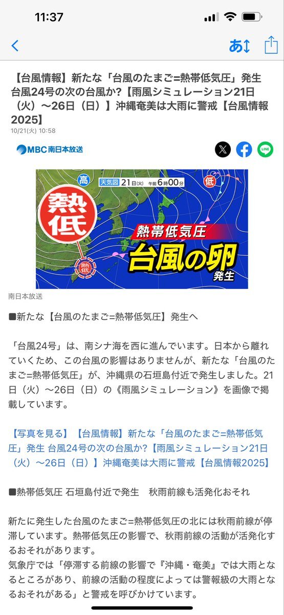 【台風情報】新たな「台風のたまご=熱帯低気圧」発生 台風24号の次の台風か?【雨風シミュレーション21日(火)〜26日(日)】沖縄奄美は大雨に警戒【台風情報2025】(MBC南日本放送) #Yahooニュース news.yahoo.co.jp/articles/76089…